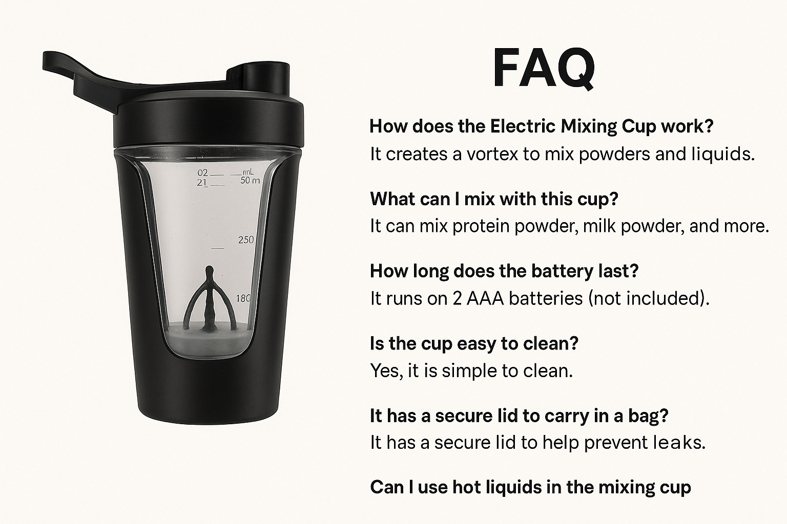 The cup uses a small motor at the base to create a vortex that mixes powders and liquids evenly. You simply add your ingredients, press the button, and let it blend on its own. It is designed to prevent lumps and improve consistency. This makes it ideal for protein shakes, coffee, and other daily drinks.